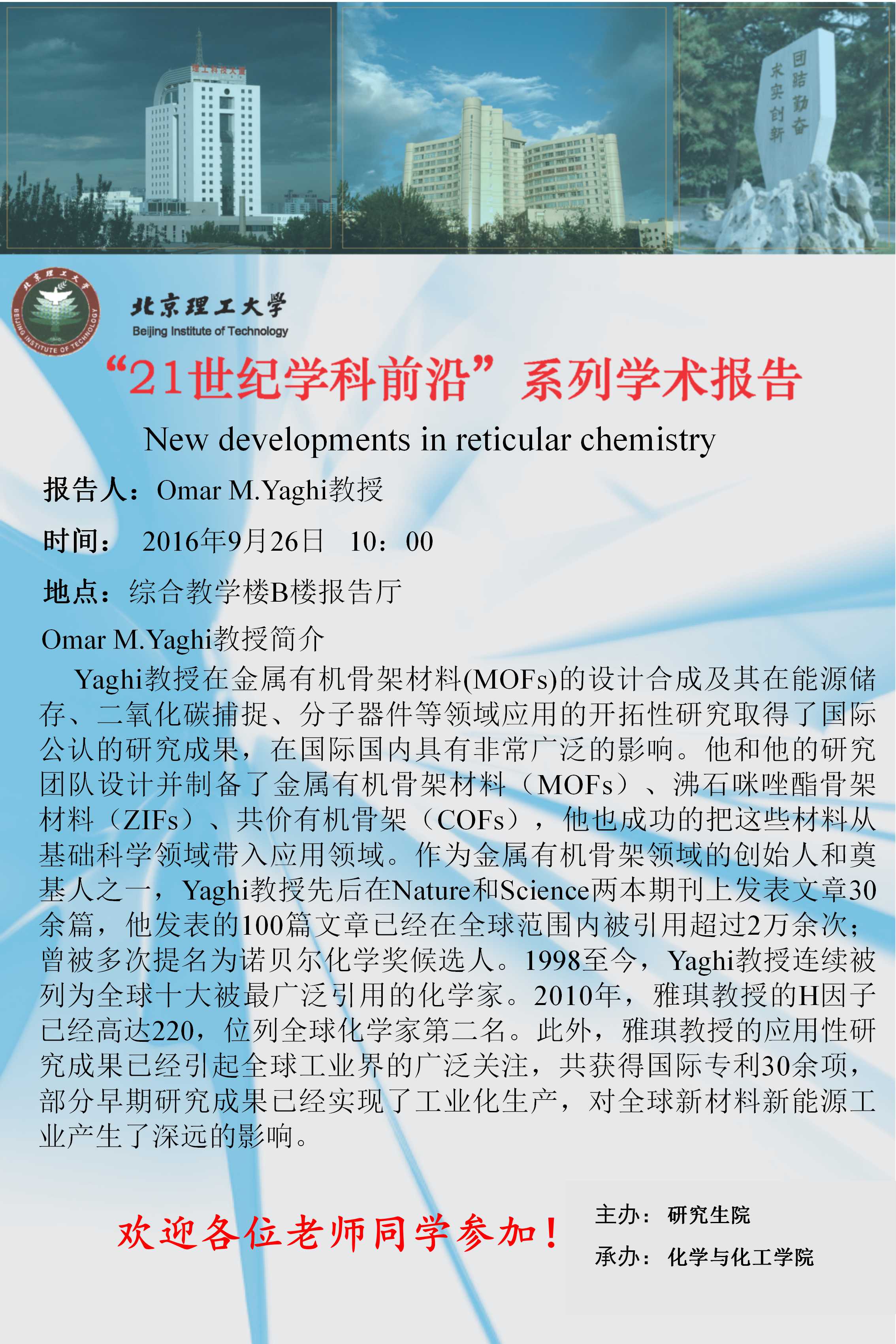【化学与化工学院】“21世纪学科前沿”Omar M.Yaghi教授学术讲座通知