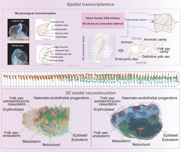 文章对CS8人类胚胎进行62张的连续切片,进行了Stereo-seq高分辨率的空间转录组研究。三维重构了人类CS8胚胎的3D模型,并鉴定了关键位置的一系列细胞亚型。整体性地描绘了胚胎形态、细胞类群、空间位置和转录组特征,阐述了原肠胚形成过程中细胞发育过程、谱系轨迹变化和一系列调控活动。开创性地发现了CS8时期的人类胚胎尾部很可能存在一个和中部脊索类似的信号源,为窥探人类极早期胚胎发育提供了重要窗口。