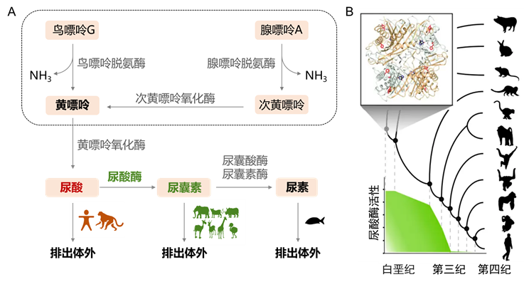 图1 嘌呤代谢通路与进化的关系。A 尿酸代谢方式示意图;B 尿酸酶进化示意图