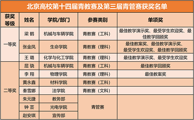 12月6日,北京高校第十四届青年教师教学基本功比赛及第三届管理岗位青年教职工职业能力竞赛获奖名单公布,北京理工大学共获奖8项,单项奖11项。梁鹤、张金凤、王璐3名教师获青教赛一等奖,一等奖数量与清华大学、中国人民大学等高校并列北京高校第一名;青教赛一、二等奖获奖7项,创历史新高;理科类获2项一等奖,实现历史性突破,一等奖数量位居北京市高校第一。